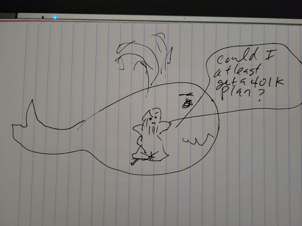 Don’t report to work, God sends a storm after you. Try to drown yourself. He sends a giant fish to swallow you and spit you out at the job site. You’re not even allowed to die. When I was a newspaper editor I used to joke that if I died, they’d put a laptop in the casket and make me finish the next edition before I could lay down. I also got a kick out of the Ninevah repenting so hard even the animals had to fast and wear burlap sacks. That’s some serious compliance. I guess they could tell Jonah was in a really bad mood.