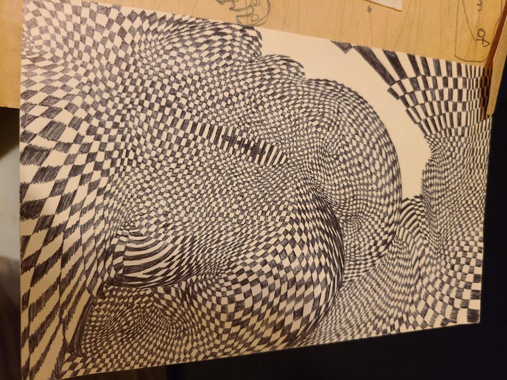 It was apparently fashionable in the 60s to decorate clothing and other items with distorted black and white checkerboard patterns. Most of it was eye-poppingly hard to look at, but the principle of it attracted me.